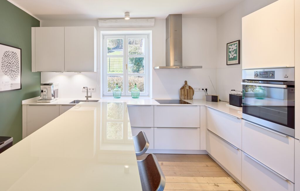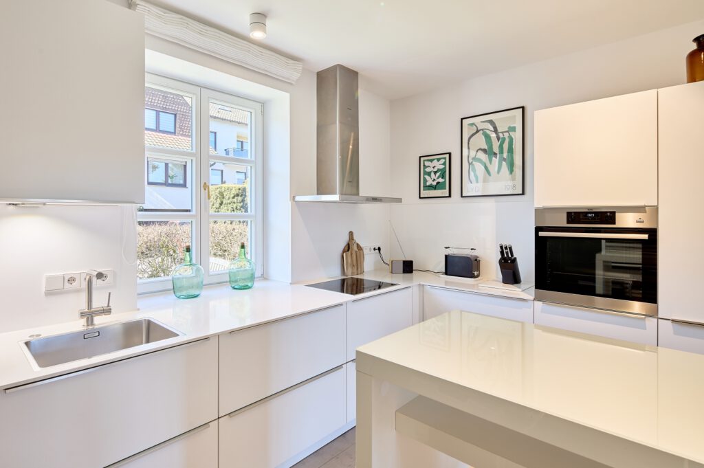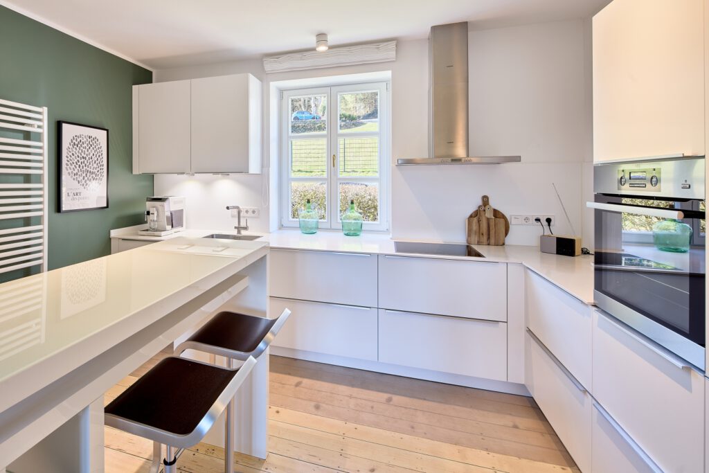 - Moderne Küche: Küchentheke mit 2 Hochstühlen, Ceran-Kochfeld, Backofen, Geschirrspüler, Kühlschrank, Gefrierschrank, Wasserkocher, Kaffee-Vollautomat für Bohnen, Toaster, Bluetooth Radio