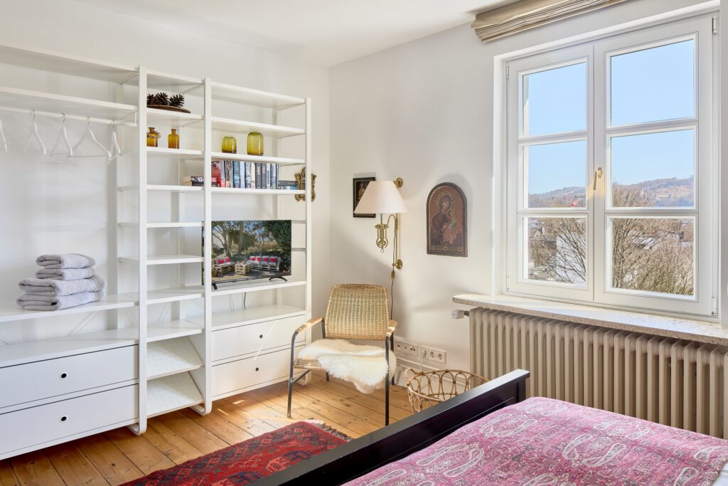 - Schlafzimmer: Doppelbett (1,60m x 2,00m), Fernseher, offener Kleiderschrank