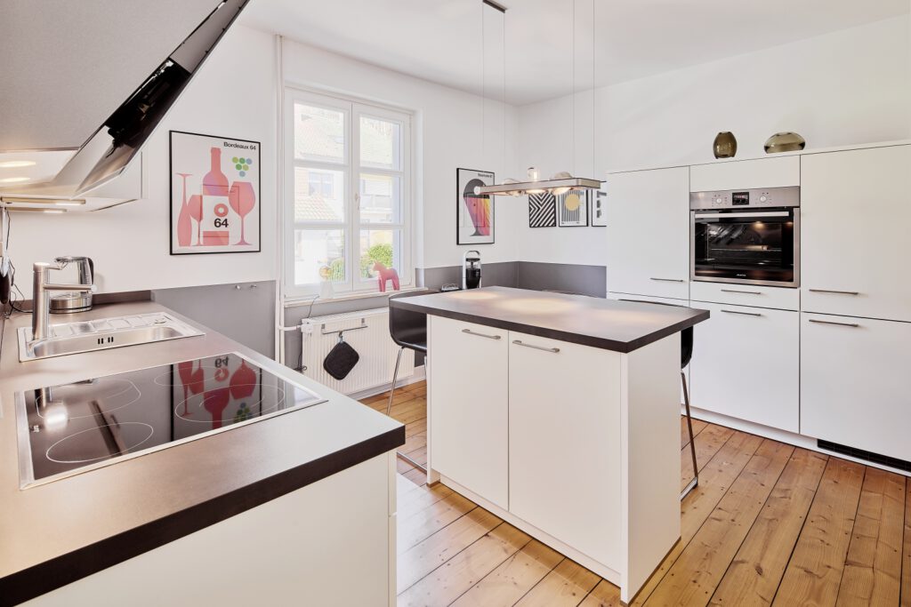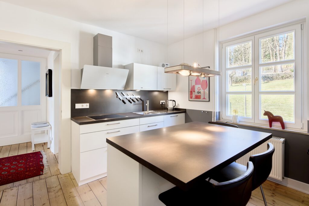 - Moderne Küche: Küchentheke mit 3 Hochstühlen, Ceran-Kochfeld, Backofen, Geschirrspüler, Kühlschrank, Gefrierschrank, Wasserkocher, Kaffeemaschine, Toaster, BluetoothRadio